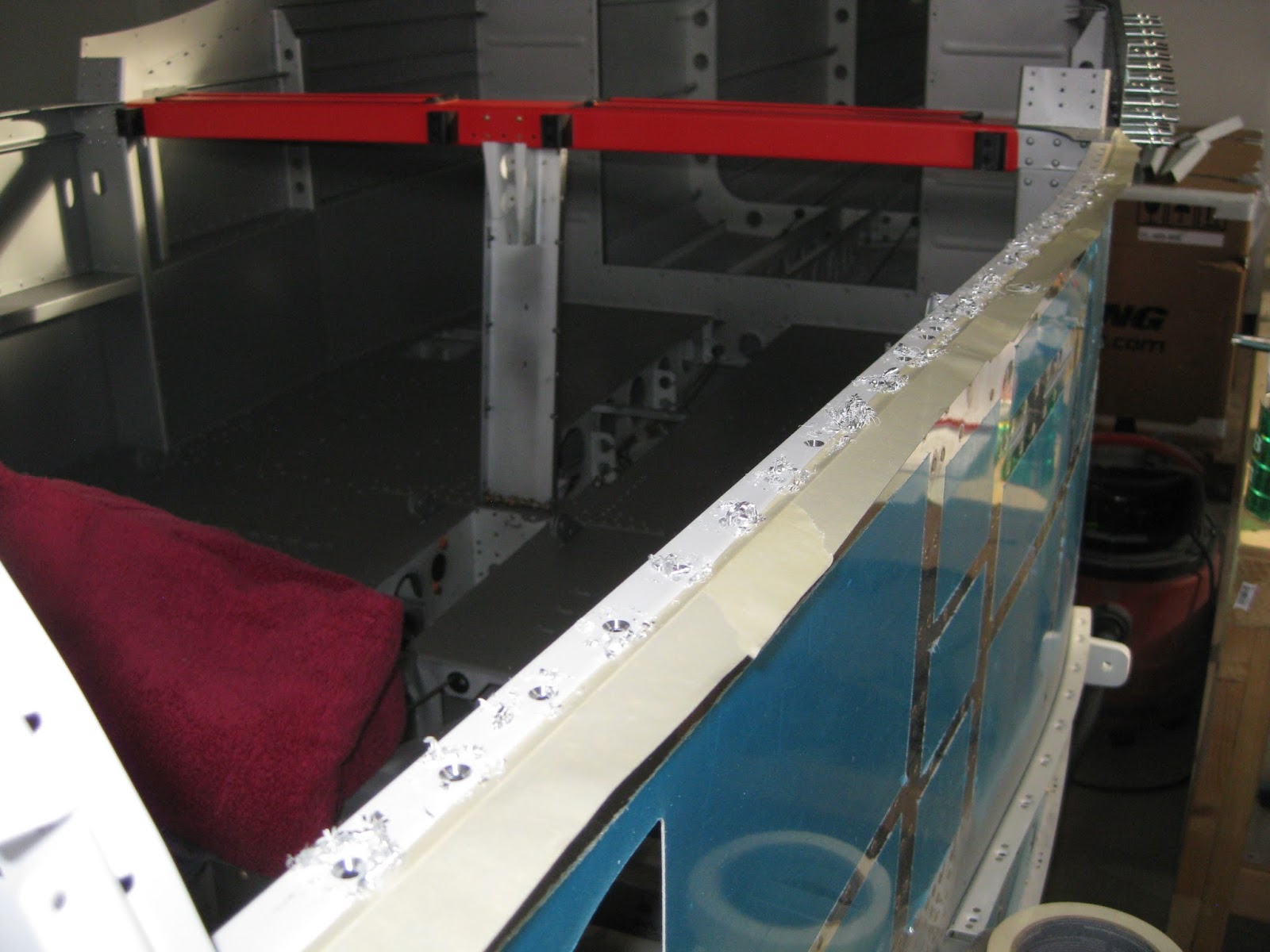 The F-01431D window shims need to be countersunk for CS4-4 rivets (remember to use your 120° countersink). Those shims aren't very thick, so without additional support, the holes would be hollowed out by the countersink pilot. Thus, I chose to countersink the shims when they were cleco'd on the roll over structure. Also, prideful rivets aren't desirable here, as the rear window rests on the shims.