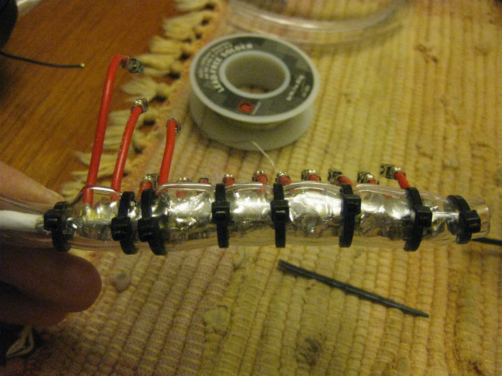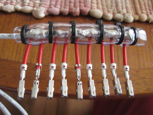 Each bus was then insulated with heavy poly tubing. This reduces the possibility of chaffing (especially since the solder wasn't smoothly applied) and shorting. Below shows the nine position Avionics 2 bus.